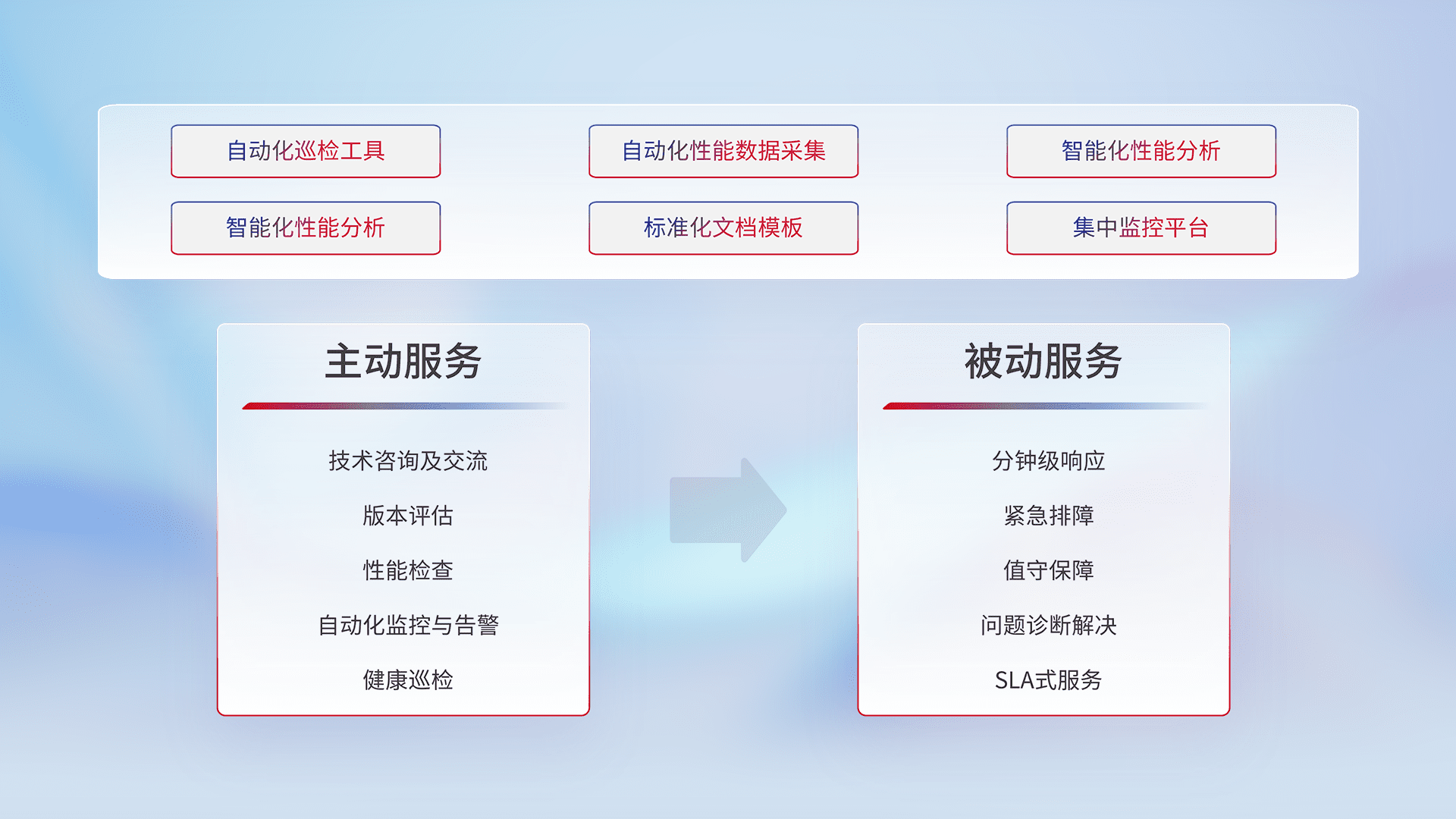 智能化工具和标准化文档,,保障服务质量,,提供主动服务(包含技术咨询、、版本评估、、、性能检查、、、自动化监控与告警、、健康巡检)和被动服务包含(分钟级响应、、、紧急排障、、值守保障、、、问题诊断解决、、、、SLA服务)。。