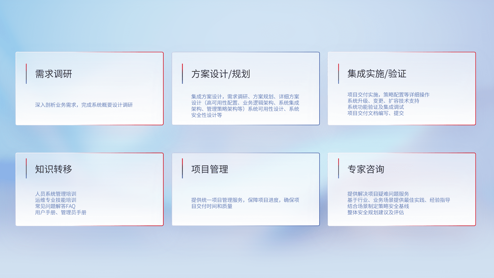针对客户行业特性,,将宏观的安全战略和需求,,通过专业的交付服务,,实现项目落地,,,为客户提供标准规范的集成交付服务。。。。