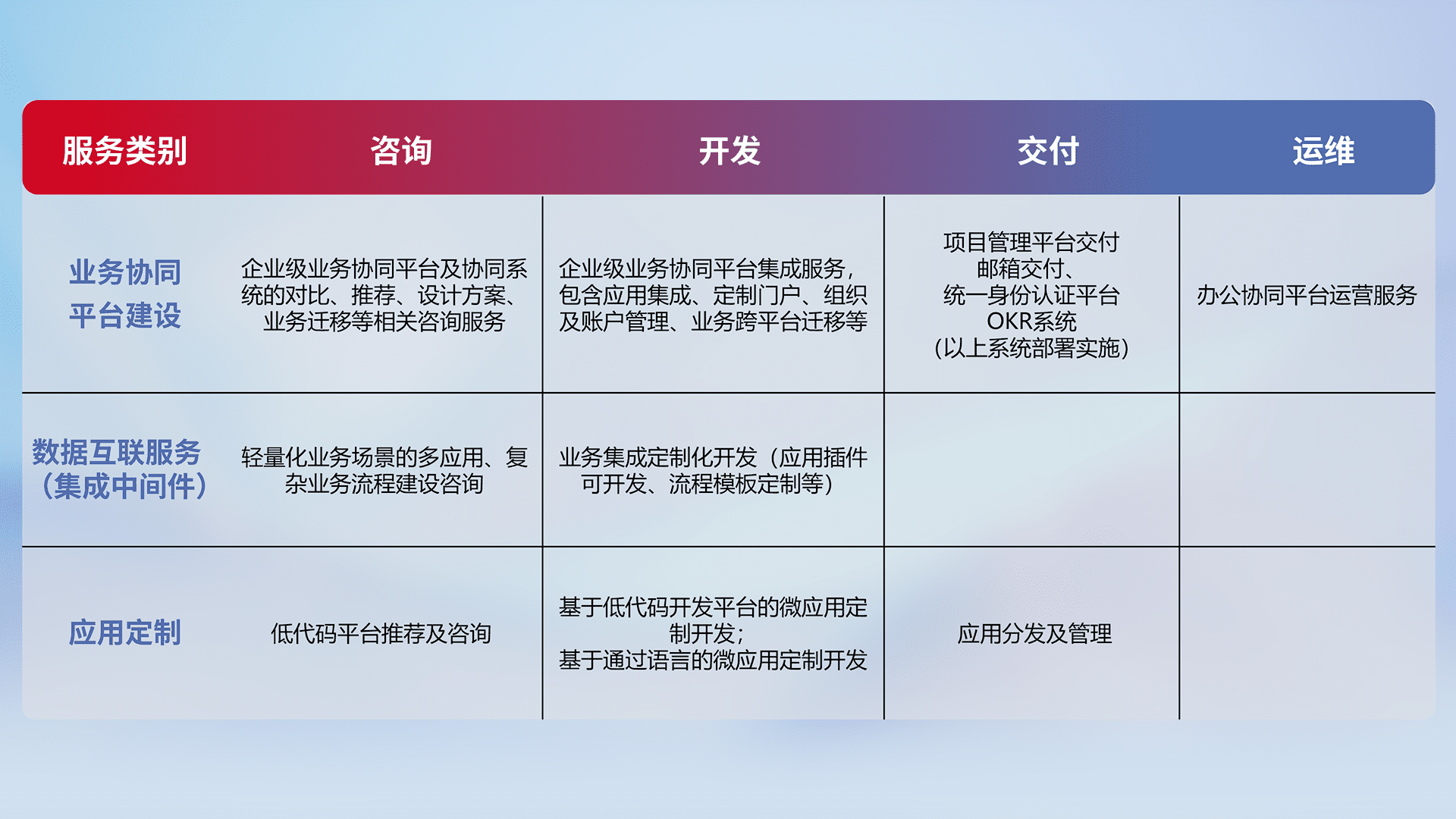针对钉钉、、、、企微、、、、IDaas等平台级产品提供产品的规划、、、方案、、、、交付、、定制化开发等服务,,,实现如统一协同办公、、、、智能客户服务、、、混合会议管理、、、智能数据查询、、、等业务场景,,,,实现数字化转型。。